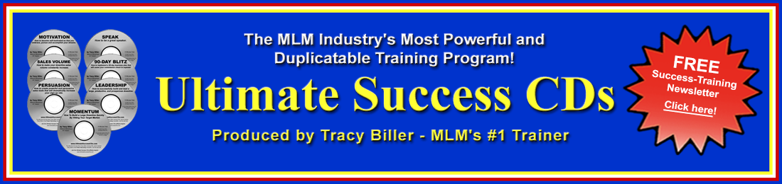 "It's easy to succeed and make lots of money in networking marketing when you and your downline are trained with the Ultimate Success CDs!" Tracy Biller’s Ultimate Success CDs contain the most competent, effective, and duplicable training ever offered in the 70-year history of network marketing. That’s why hundreds of thousands of network marketers throughout the United States and in nearly 60 countries are using Ultimate Success CDs to receive their training and to train their downlines. Now only $19.95 for the complete set! |